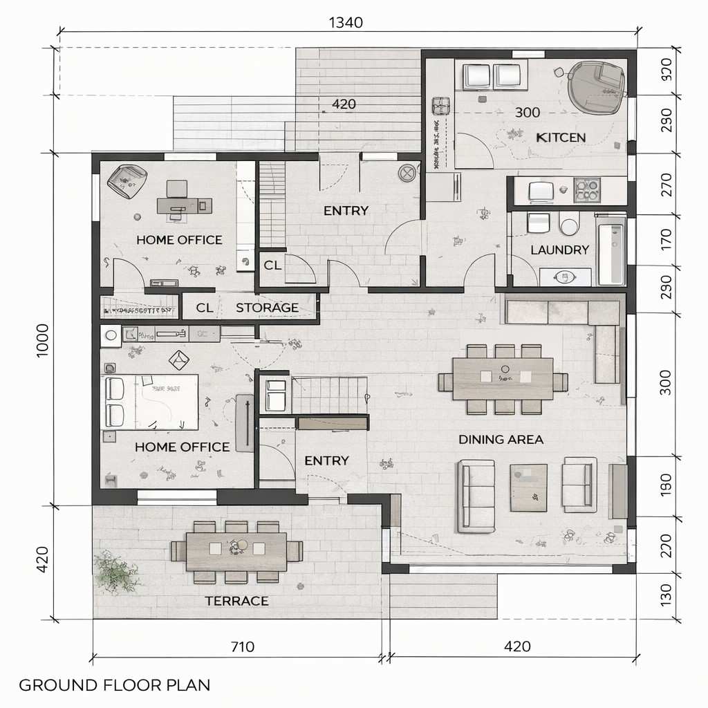 Two office rooms located on this level provide flexible spaces for work, study, or guest accommodations. The ground floor also includes storage closets and circulation pathways that maintain a smooth flow throughout the house.