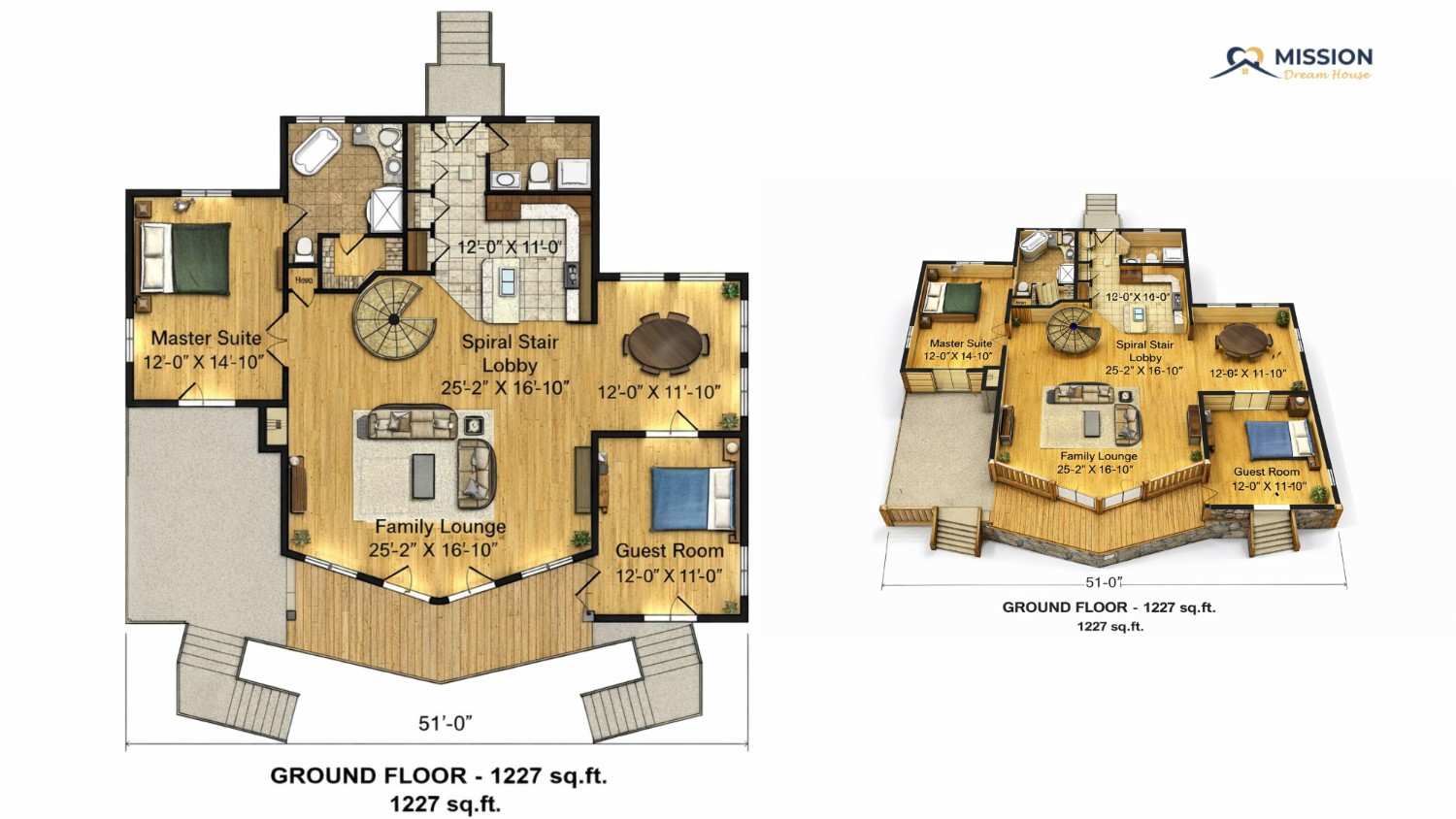 The Ground Floor of the log cabin is designed with an open floor plan that integrates the family lounge, dining area, and master suite seamlessly. Let’s break down the layout of the ground floor: