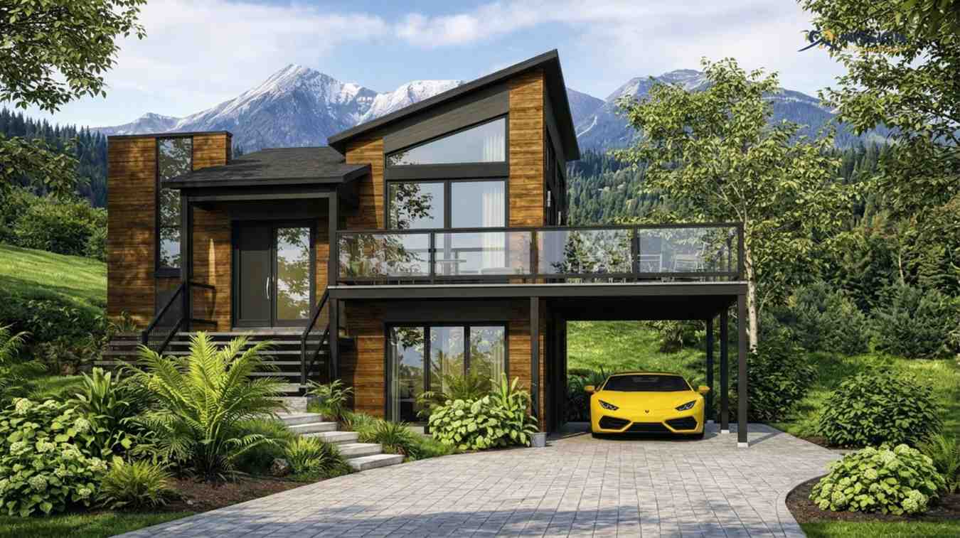 Large floor-to-ceiling windows allow sunlight to flood the interior while connecting the home visually with nature. The slanted roofline adds architectural character and helps with rain and snow drainage, making the house ideal for mountainous regions.