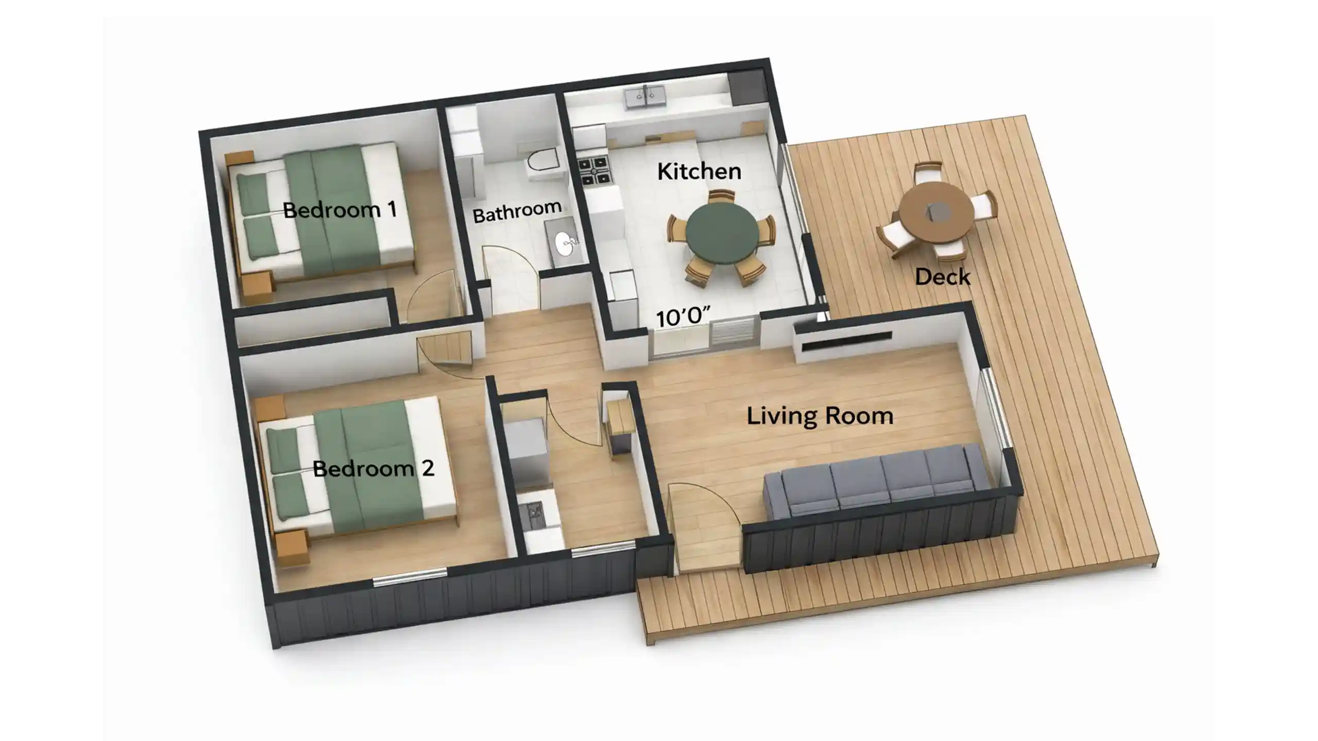 The house features two bedrooms at opposite ends of the layout. Each bedroom is designed to maximize the available space, offering enough room for a bed and essential furniture. The bathroom is centrally located, making it easily accessible from all rooms. The deck at the front of the house serves as an outdoor living space, perfect for enjoying the fresh air and surrounding views.